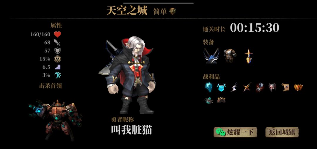 给各位(我也是)手残党一个推荐: 大鹅暴击概率眩晕,圣光护符眩晕百分百暴击,冲击弩一次攻击多段伤害,利齿护符每攻击一次会一滴血但是冲击弩一次能回6滴左右(这个没数),这样打boss基本不需要走位,boss全程眩晕而且全是暴击伤害打的也快,下面是我的战绩打完暗魔领主满血。 很多人说眩晕改了,那么大家再注意一个神器——大嘴幼崽(附图)如果刷出来千万别错过,有了这个大嘴,每200金币就能掉一个战利品比商店600买的赚了三倍(独角护甲200金币两个个战利品),你们从下面那个战利品数量就能看出来区别,困难暗魔领主无脑过