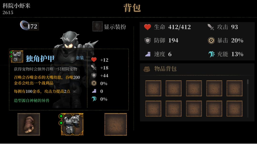 这游戏在手机上闲了好几年了,最近没玩的又捡了起来。这是这些年一直也没更新吧?[表情_思考] 发个搭配防着过两年再回来忘了怎么玩…… 奔着这几个东西使劲: 1.漆黑甲+大嘴魔像+看哪个宝石顺眼搁哪个。不回血了,就是刷护甲刷攻击。 2.独角甲+大嘴幼崽+幸运币或战争硬币。用国王皮和箭之纹章,玩召唤或刷面板怎么着都行,钱多就是硬道理。以前还有bug,大嘴的钱能带到下一局,现在不知道修复没。 3.暗