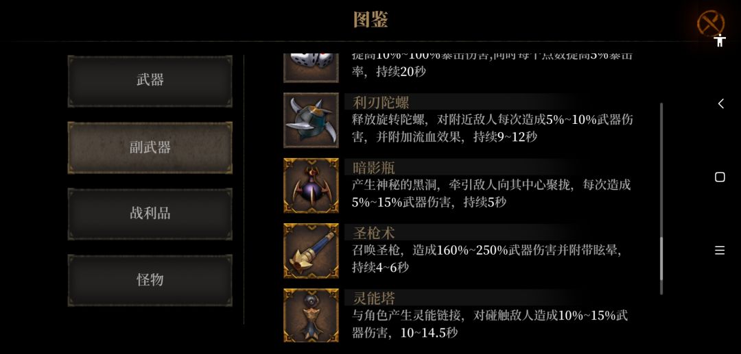 自己玩了几天也有一些心得, 萌新前期武器用弩就行了, 武器和副武器战力品别乱开,你要知道一件事,武器多了并不是好事,有时候你开局要sl好几次,而且后面商店还不容易刷出这把武器, 副武器还行,要求不是太大, 战利品别放垃圾会污染卡池的,毕竟战力品上限就那么多, 主要说下武器,开一个冲击弩和诅咒刀就好了,这把武器触发特效和吸血效果都是顶级的,其他的装备基础武器都能代替,诅咒刀一刀流核心武器 副武器开个