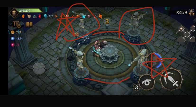 找到两个指着外面的雕像(如图上面那俩) 移动到逆时针方位的雕像①处 雕像之间的线亮起来 点两次让他俩指向中间 到①雕像对角位置雕像(如图下右) 下面两个雕像的线亮起 点一次即可指向中间