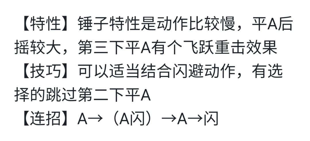 一、锤子连招 A→(A闪)→A→闪 二、拳头连招 (AA)→A→闪 三、匕首(双刀) 匕首A闪,闪A都比较顺滑 四、弓箭(弩) 蓄力A→闪 保持距离转圈圈,手残党福音 Ps:以上连招感觉体验不错,希望对大家能有所帮助,以上均为内测时内容,公测可能略有调整变动,敬请见谅 欢迎补充