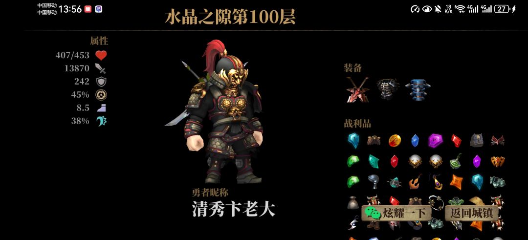 多的不说少的不唠,金甲开局那是必须。回血铠甲身上穿,然后有个新改动就是宝石舍弃掉大嘴头盔换成每100金币加2攻击力的那个,这样就不用跑铁匠。还有扣血加金币的宝石,10000多攻击力还是随便的