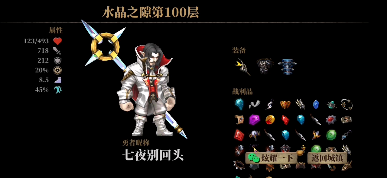开局四件套,回血甲+炼金斗篷宝石+大嘴雕像宝石+金甲将军时装。 每层稳定400到600金币金币入账,注意的是遇到锤头鲨,勇者怪和食人鱼的时候快速打死,避免翻车。 这局没有给加攻击的战争金币。20层的时候1w金币强化了一次装备,运气不错35层遇到纯背棺僵尸(6—7只),卡层后一波刷够满级武器需要。强化后,后面的直接速刷了,遇到食物优先入,50层左右攻击就2000了,什么都是秒了。。。这样的玩法最适合的副武器还是附魔药水(个人感觉)。 每天玩的比较少,每天就是刷个几局打发时间。有需要刷百层材料的伙伴可是考虑这种套路。 百层其实攻击500都能速刷,哪次试下个人速刷时间是多少😅