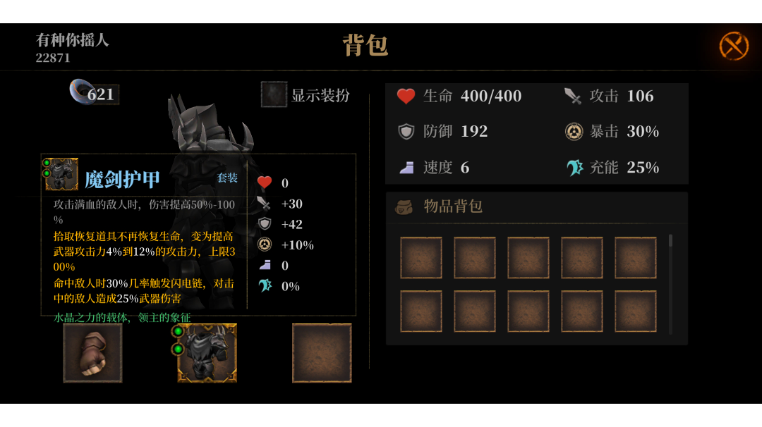 面板3500+,还能更高,但是够用 配装拳刃+剑魔镶护甲嵌大嘴和闪电链,闪电链为了前期补伤害 有肉吃肉,没肉吃金币,战利品优先级靠后,没刷到战争硬币就强化 后期基本一套一个图,一套一个boss,爽的一批
