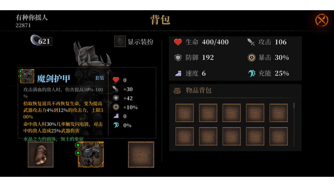面板3500+,还能更高,但是够用 配装拳刃+剑魔镶护甲嵌大嘴和闪电链,闪电链为了前期补伤害 有肉吃肉,没肉吃金币,战利品优先级靠后,没刷到战争硬币就强化 后期基本一套一个图,一套一个boss,爽的一批