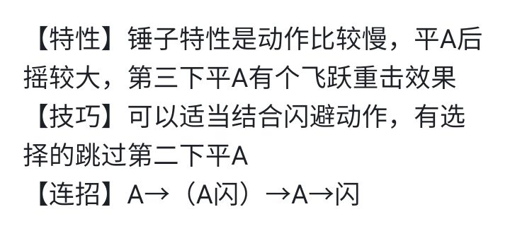 一、锤子连招A→(A闪)→A→闪二、拳头连招(AA)→A→闪三、匕首(双刀)匕首A闪,闪A都比较顺滑四、弓箭(弩)蓄力A→闪保持距离转圈圈,手残党福音Ps:以上连招感觉体验不错,希望对大家能有所帮助,以上均为内测时内容,公测可能略有调整变动,敬请见谅欢迎补充