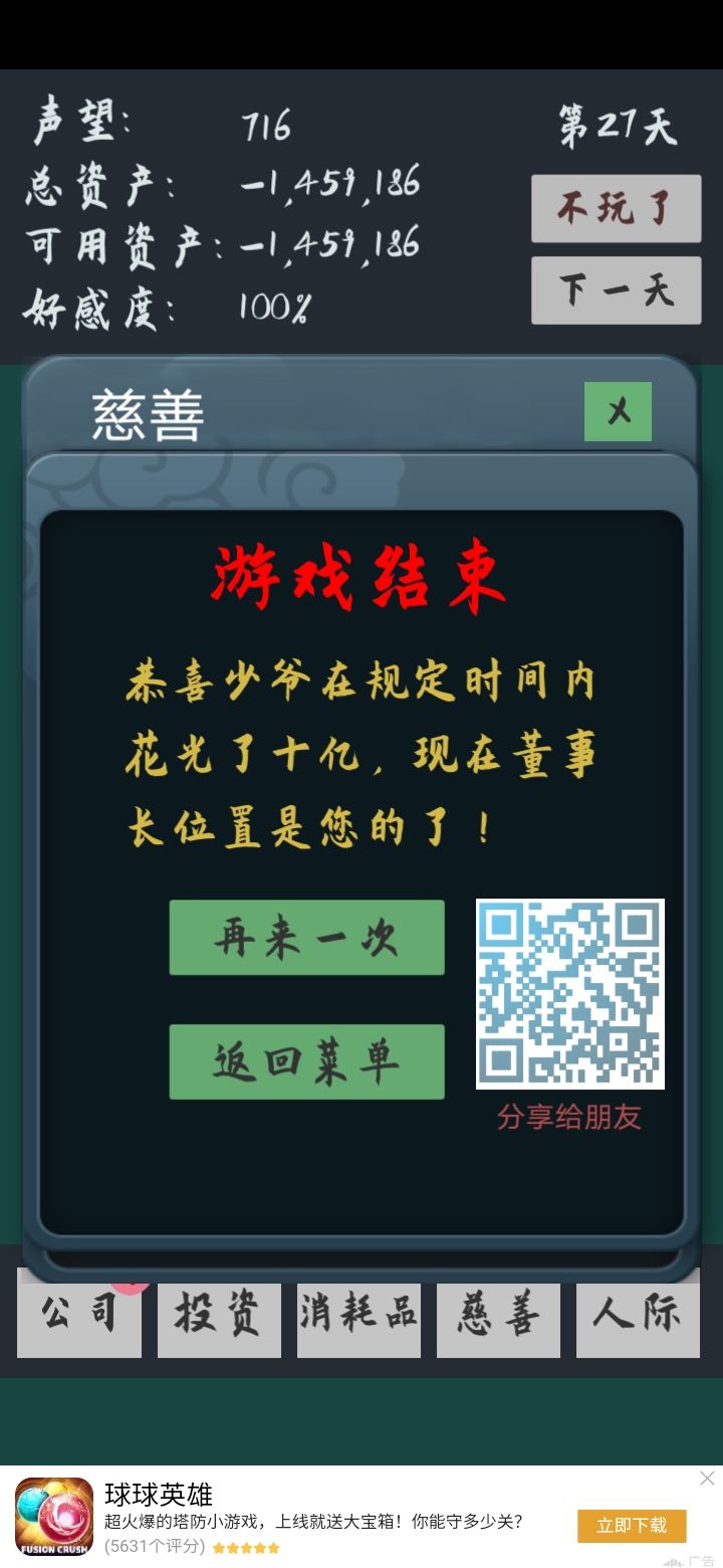 第一第二天如果慈善没有刷到20声望不要去酒会,声望不加反减。然后公司转盘完全就是靠蒙的,基本上没法去看。前期尽快搞到一个老婆,然后老婆可以经常换,因为你离婚后再去加好感失败的几率会变大,是个花钱的方法。(老婆这里说一下:颜值和人品越低的老婆离婚降的声望越高,呈规律递减最小1。然后颜值越低的你越容易加好感)酒会里前期遇到投资果断去选,只要你连续不断投资半个月左右就会有诈骗,诈骗扣的钱比你投资赚的要多多了。老婆也是一样,你只要连续不断的约会就会遇到仙人跳和陪酒,也扣钱多。能卖的投资这边建议过一天就卖掉,不管涨跌,因为它们基本上最后都会疯涨的。中间那个五千万看情况要不要,如果当时你钱少于一半(就是500.000.000)其实你可以不要。