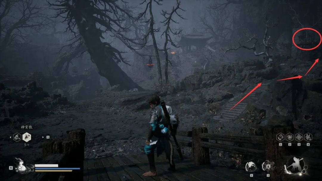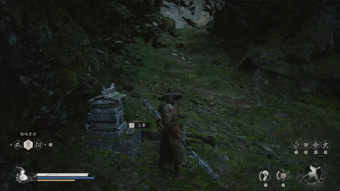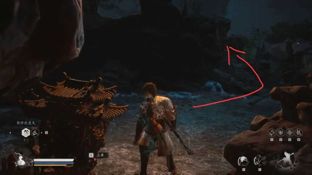 通关完第四回,那个片尾真的让人意难平。话不多说,我把攻略交给大家让大家自行体验吧。书接上回我们来到黄花观—山道,沿着山路往前走到出现石栏杆,我们左边平台供桌上能拿到酒食—蜂山石髓,其效果非常厉害,有几率让我们喝酒不消耗次数。 拿完东西后,前方有一团灵蕴,左边是上山的道路。 前方灵蕴,左边上山 沿着山路往上,到达一处平台上,右侧有一小团灵蕴,前方能看见一只虎头蛇身怪,他的背后有一个宝箱,打开后获得材