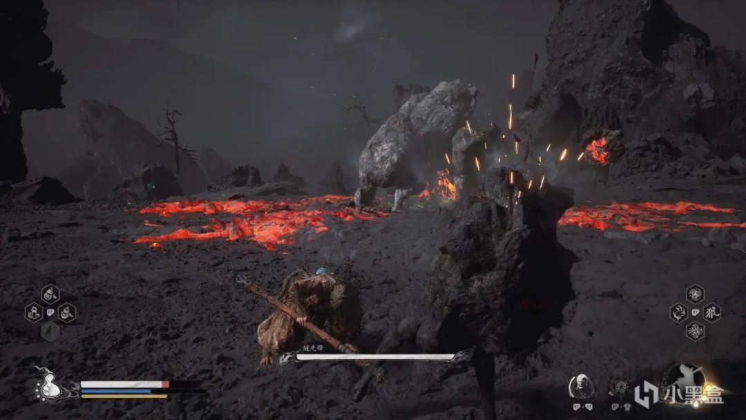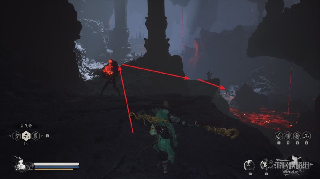 体验及解析:燧先锋的位置比较特别,在会滚动的大球过去的路上,右边有一面火墙,然后要上去前面触发芭蕉扇扇灭火的动画以后,这条路才会开放,位置路线也提供给大家。燧先锋和石先锋很相似,感觉就是变异版本。燧先锋会三连下砸,但是不会石先锋一样下崽,打起来比较简单。用聚形散气+重棍蓄力打,并且不要忘了自己的辟火罩。 路线位置: 火扇灭才能过去 一堆碎石头就是燧先锋