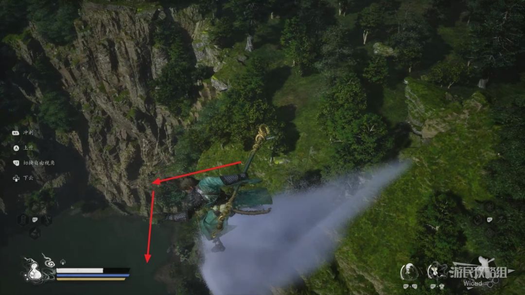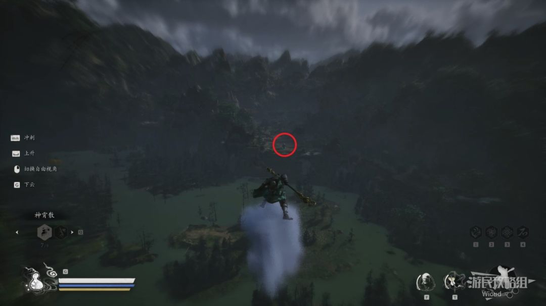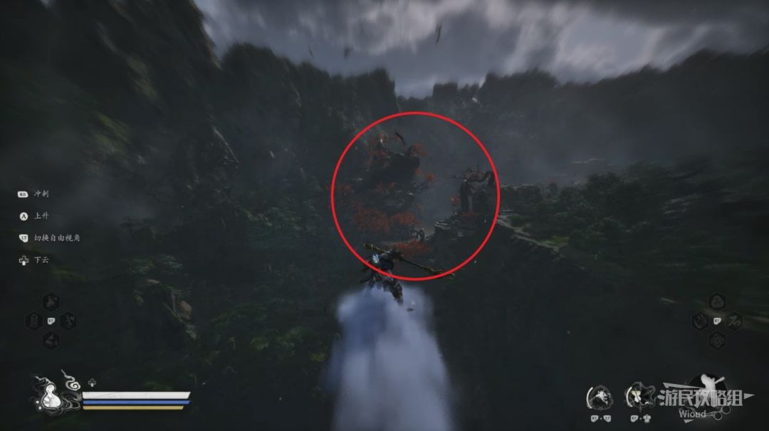 体验及解析:风翅将军他是跳来跳去的,两个落点在石子对面,大家应该可以看到。 这个大蚂蚱不用打的,凤翅紫金冠(大圣的标配)在它的头上,我们上去它头上拔出来就行了。这里要注意:一是抓住了不要松手一直按住(就算你看到大圣松手你也别松手)。二是第三次落地以后使用辟火罩,不然握不住。 抓住不要放