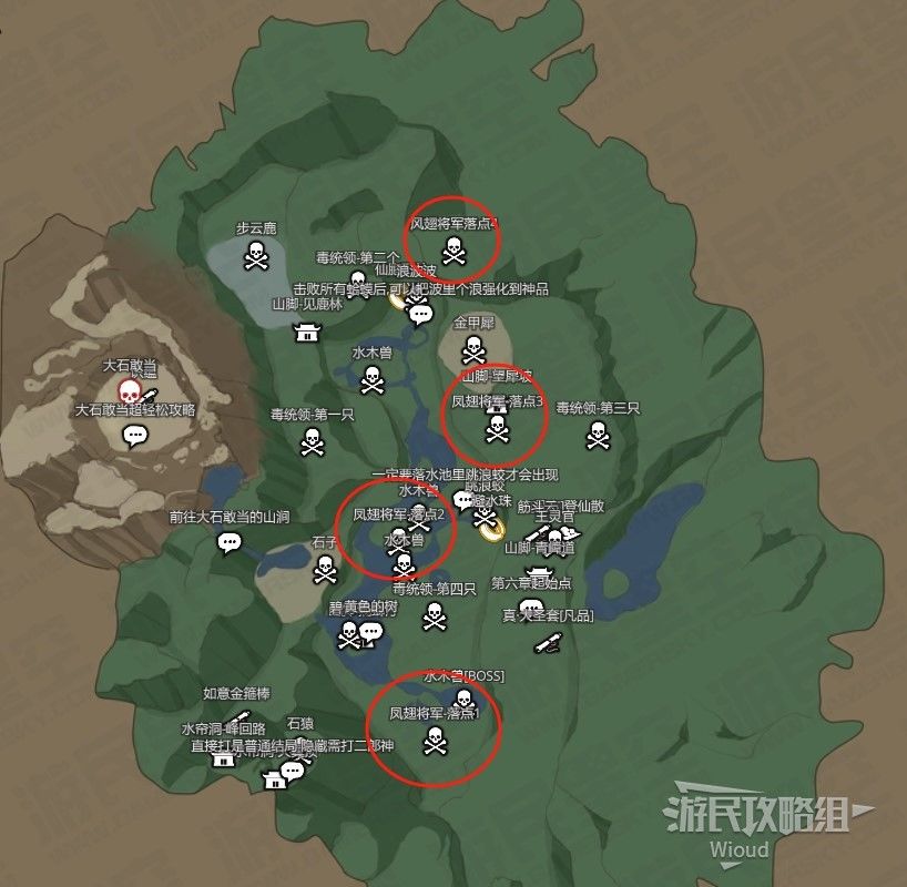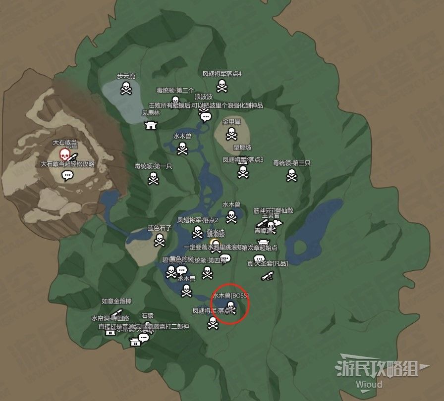 第六回头目-水木兽游记位置位于游记第六回头目词条【毒统领】的下方。 具体位置水木兽分BOSS血条与精英怪血条两种,攻击方式没有区别,只是血条厚度有差距。 下图画圈处为BOSS血条的水木兽位置,周围还有很多精英怪血条的水木兽,注意区分。 互动地图:。 击杀奖励因为水木兽数量众多,此处不再概述。 BD推荐棍法点到四层棍势,定身法、身外身法与聚形散气都点满,其他加点可随自身喜好来。 招式解析与应对方法水