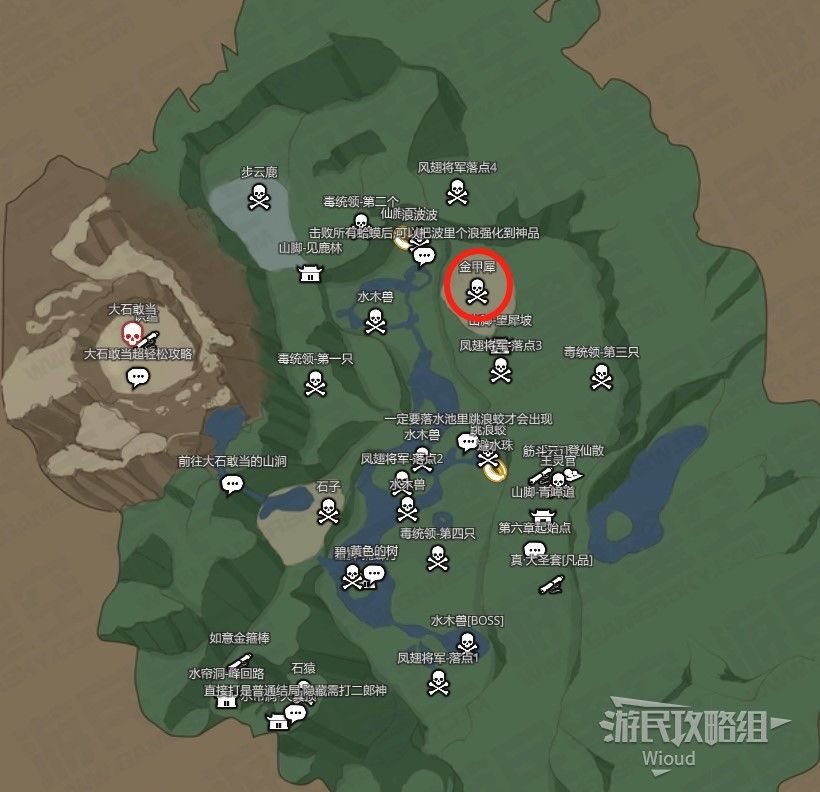 体验及解析:跳浪蛟位置在望犀坡土地庙附近的水池里面,位置标记出来给大家。 跳浪蛟主要是扫尾很痛,它潜水的时候注意闪避就行,开局进去先翻滚一下,因为他会突然跳出来。打完会获得辟水珠(不是法宝,在水面上战斗会增加防御力)。 路线位置: 这个水潭