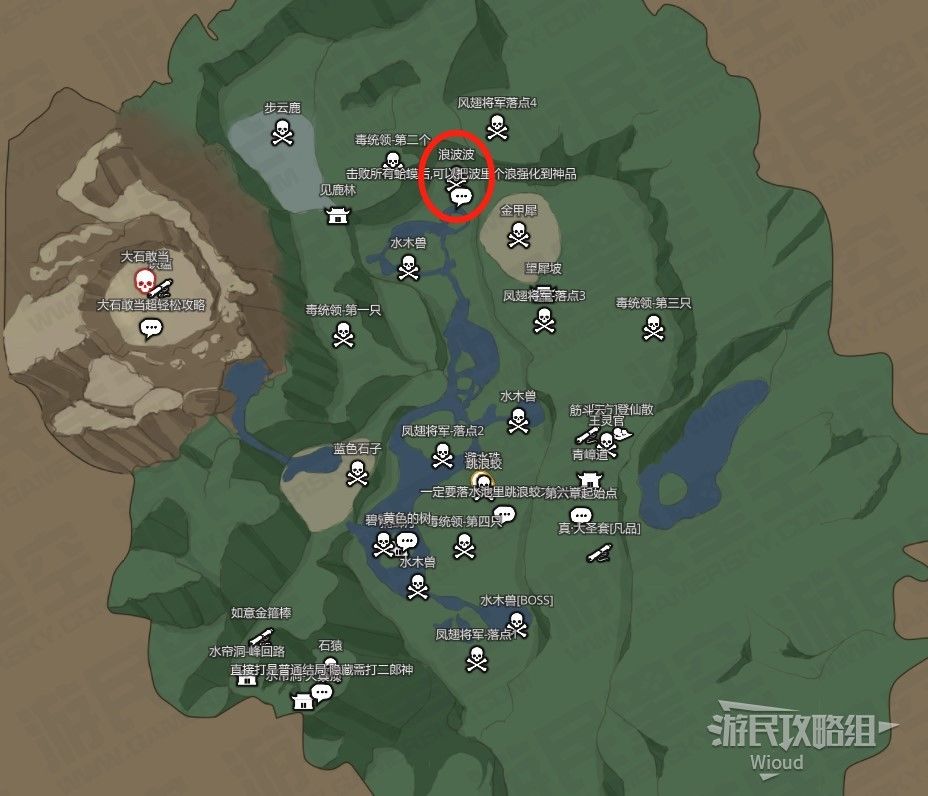 第六回头目-浪波波游记位置位于游记第六回头目词条【跳浪蛟】的下方。 具体位置在花果山地图靠上的位置,互动地图:。 一直飞到尽头可以看到一片荒地,在此处落地触发BOSS战。 击杀奖励珍玩【仙胞石片】、灵蕴2739、寒铁叶2、细金线1、小活师1。 BD推荐棍法点到四层棍势,定身法、身外身法与聚形散气都点满,法宝携带芭蕉扇,变身选择石头人,其他加点可随自身喜好来。 招式解析与应对方法BOSS出现后可以看