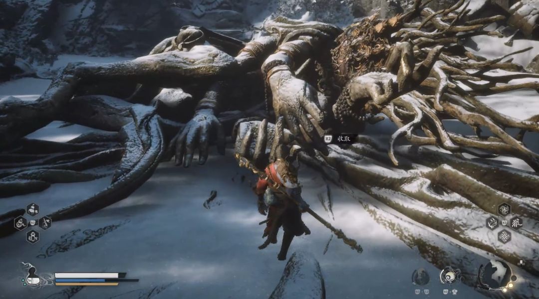 本章内容包含BOSS—赤尻马猴、魔将·妙音、魔将·莲眼、亢金龙、浮屠塔,以及两个蒲团位置。我们继上一张被传送到小西天后,直接往前走,阶梯左下方有怪物镇守的宝箱,开启后是一堆破铜烂铁,穿过山洞我们到达小西天第一个土地庙雪山径—披霜道,点亮后往前走遇到BOSS赤尻马猴,但是它很聪明只是惊动小怪,来试试我们的实力。这些小怪挺好打的不过要注意,拿狼牙棒的小怪死后触发亡语,向前攻击三下,我们打完后就离开,不