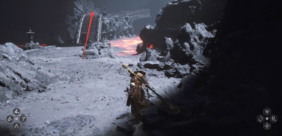 第五回应该是信息量最大的章节,最后的动画虽然看过不止一次,但是每一次都会觉得难受。话不多说,我们马上开始。我们在上一章刚搜刮完翠云殿,我们沿着翠云殿侧面的山道而上,上到山上平台,我们的左侧能看到一个宝箱,拿完宝箱后我们继续沿着山道往上走。 到了一个山洞里,皓斧力士和红银战车在战斗,我们帮助皓斧力士打败红银战车后,与之对话完毕,方便触发下一阶段任务,我们右侧树枝上有一团灵蕴,拿完后继续上山,来到火光