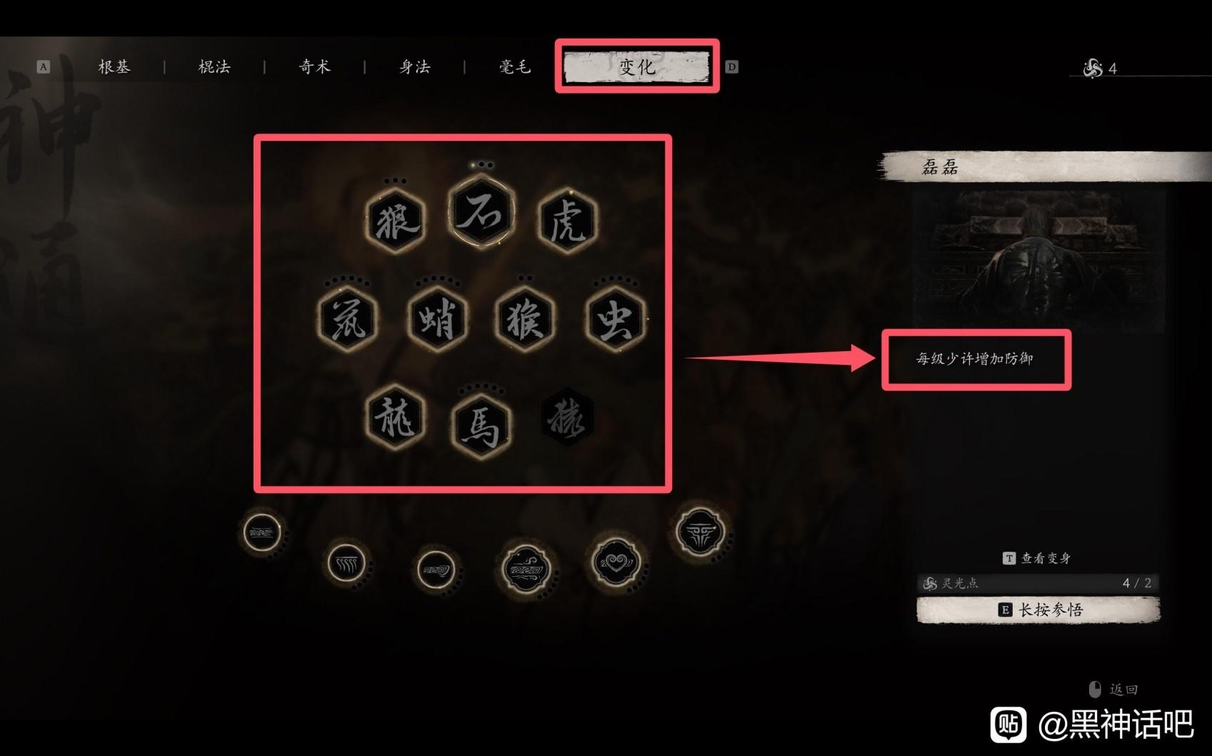 《黑神话悟空》是一款上手难度比较高的游戏,那么在游戏的游玩过程中有哪些小技巧可以使用呢?下面请看由“彩虹牛仔”为大家带来的《黑神话悟空》游玩技巧分享,希望可以帮助到大家。 变化的升级下图描述变化升级的效果是一直存在的,不需要变化成相应人物也是有效果加成的(如增加防御,这里是永久增加15) 根器重修很多人只知道修行的重新,其时在重修界面修行的左边也是有根器的重修的 传送在背包页面使用缩地青符是可以直