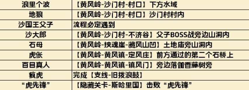 第二回-黄风岭 BoSS:小骊龙拿到飞龙鳞片才能打,鳞片在BOSS沙大郎旁边的佛壁内,需要破墙开路(使用幽魂精魄即可)。 BOSS:疯虎需要做旧拨浪鼓的支线任务才能打,触发方法:打败虎依后拿到拨浪鼓,然后在黄风阵-定风庄往回走下坡,触发小孩咳嗽剧情。 BOSS:石敢当、五蕴:受蕴找齐6个佛目珠再找到石敢当就能触发战斗,打败他可获得五蕴中的受蕴。 BOSS:蝜蝂需要做斯哈里国的支线任务才能打,触发方