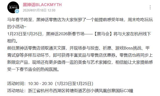 1月18日,《黑神话悟空》官号【黑神话BLACKMYTH】发文,1月23日至1月25日,黑神话2026新春节场——【黑马会】将与大家在杭州线下相约。活动期间,官方在杭州给大家准备了一个吃吃玩玩的小活动,领取通关文牒,并现场参与投壶、祈愿、游戏Boss挑战、甲胄试穿等多样互动!活动时间:10:30 - 20:30(1月23日至1月25日)活动地址:浙江省杭州市西湖区转塘街道艺创小镇凤凰创意国际