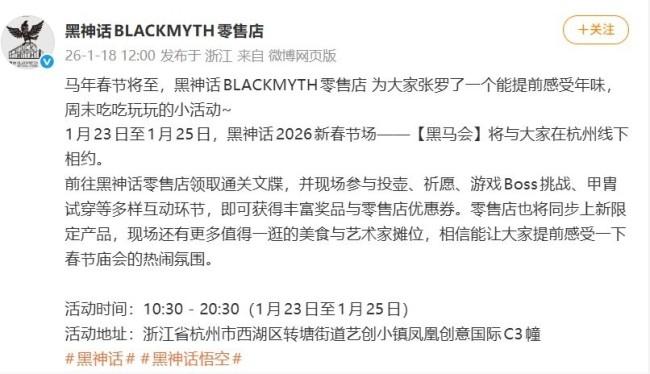 1月18日,《黑神话悟空》官号【黑神话BLACKMYTH】发文,1月23日至1月25日,黑神话2026新春节场——【黑马会】将与大家在杭州线下相约。活动期间,官方在杭州给大家准备了一个吃吃玩玩的小活动,领取通关文牒,并现场参与投壶、祈愿、游戏Boss挑战、甲胄试穿等多样互动!活动时间:10:30 - 20:30(1月23日至1月25日)活动地址:浙江省杭州市西湖区转塘街道艺创小镇凤凰创意国际
