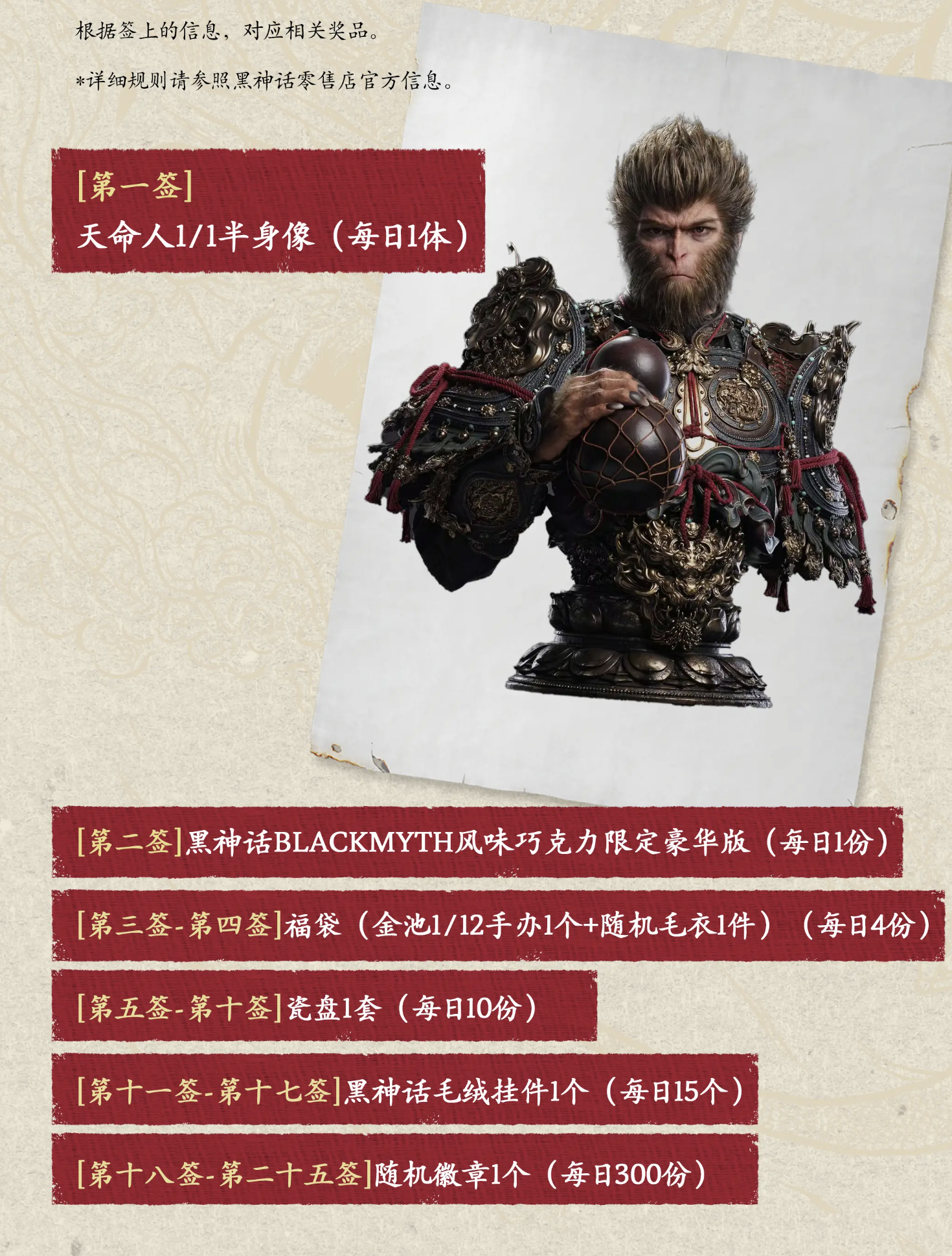 《黑神话》官方零售店此前宣布将于1月23日至25日在杭州举办名为“黑马会”的新春主题线下活动,今日已公布活动详情:参与者可在活动入口处领取“通关文牒”及六张空白“交子”,随后前往八个互动点位打卡盖章。这些互动点包含书写祈福、试穿甲胄、投壶游戏以及现场挑战《黑神话:悟空》游戏内“齐天难度”Boss的竞速比赛等。每张盖有活动章的“交子”可在店内消费时抵扣五元,集齐六种不同印章的玩家还可参与每日抽奖,