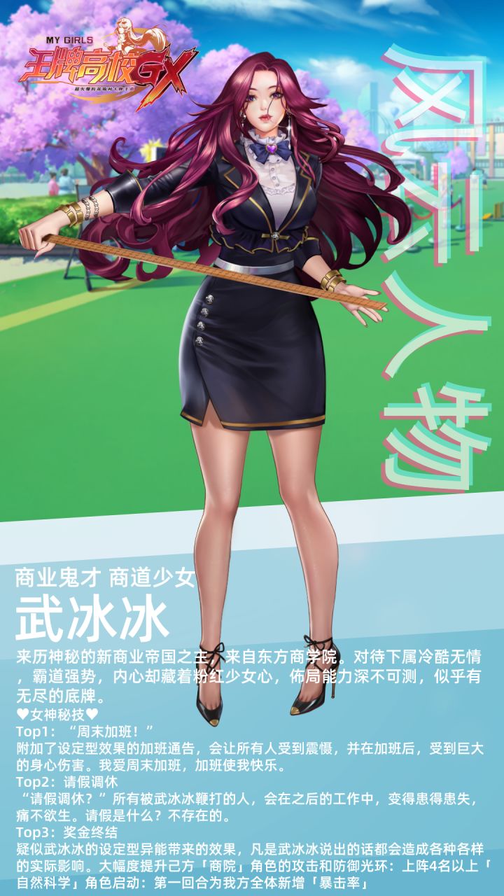 即将踏入《王牌高校》的你是不是很想知道学园的一些风云人物呢?她们之所以能成为各大高校之星和异能精英是因为她们个个性格迥异、特点鲜明、身怀绝技她们为了共同抵御邪恶势力而聚集到王牌高校这所学园!可是你知道吗?她们原本是各自作战,互不交涉的而现在,却可以因为你的到来而开始发生改变的哦!你可以通过层层挑战各大高校获得认可,并在途中结合各类伙伴壮大队伍,带领全体异能者捍卫正义哦!听到这里,你