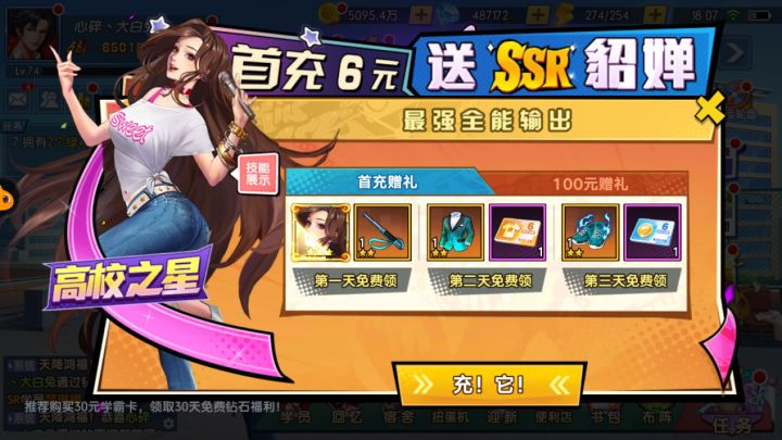 新生攻略一、【完整系统攻略】总的来说,这个游戏就是超级简单,推图集卡养高校之星,充不充都可以爽,但拿下首充,就能爽到飞起,因为只有首充送貂蝉,这个SSR卡可单可群,还能升UR,就问你,香不香!按指引先拿到6张卡凑齐阵容,游戏首日送20连抽,卡特别好拿,就一个原则——但凡是SSR卡,养他!!通过后期收集到的碎片,可以对卡片进行升星。如果你第一天就想手握各种高校之星,那就搞张月卡,首日凑套SSR