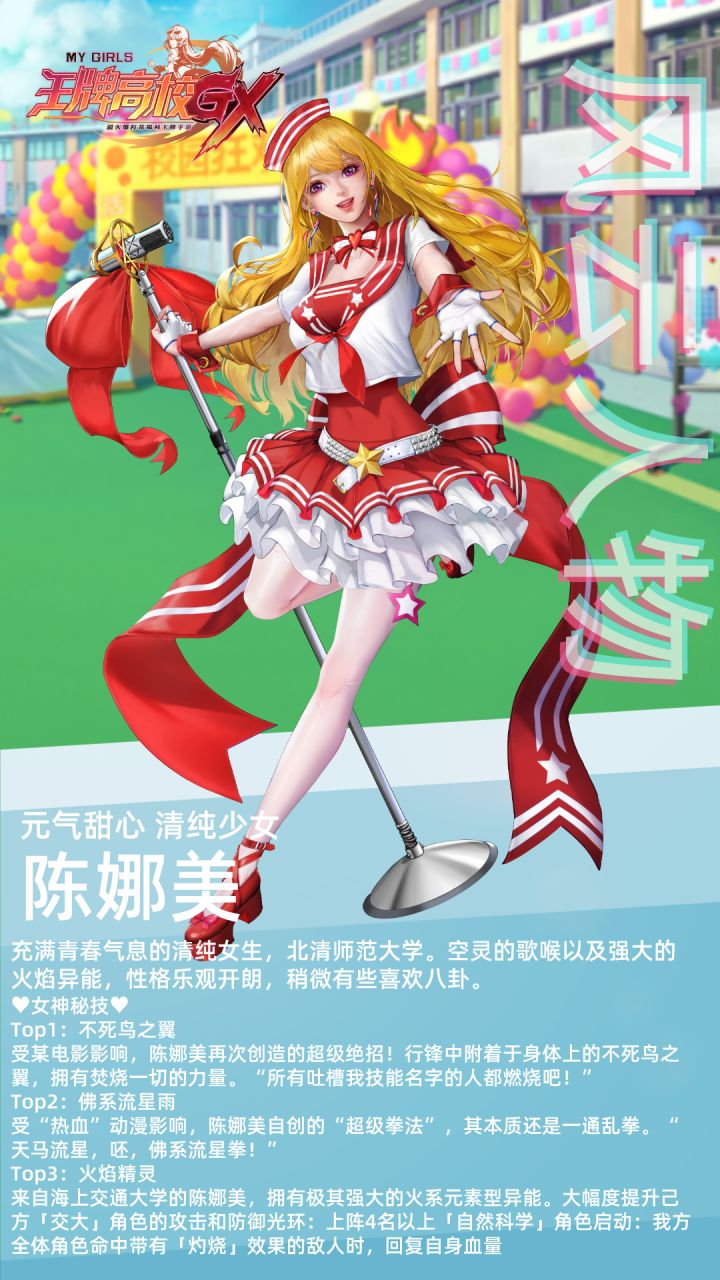 前几天才和你们分享了高能阵容的搭配现在就带给你们角色情报的解析哦,也是满满的干活呢一、角色简介陈娜美作为高校第一的师范生,拥有美妙的歌喉和强大的火焰异能,是当之无愧的北清师范大学榜样,她性格十分的乐观开朗,不过稍微有些喜欢八卦。[table]王牌高校陈娜美属性表攻击400防御119生命4510战力482品质SSR院校北清师范大学定位元气甜心以及暴击必杀[/ta