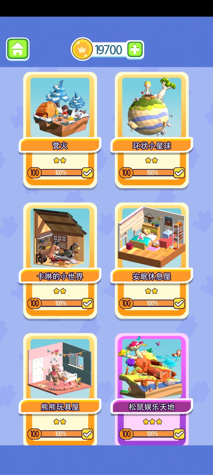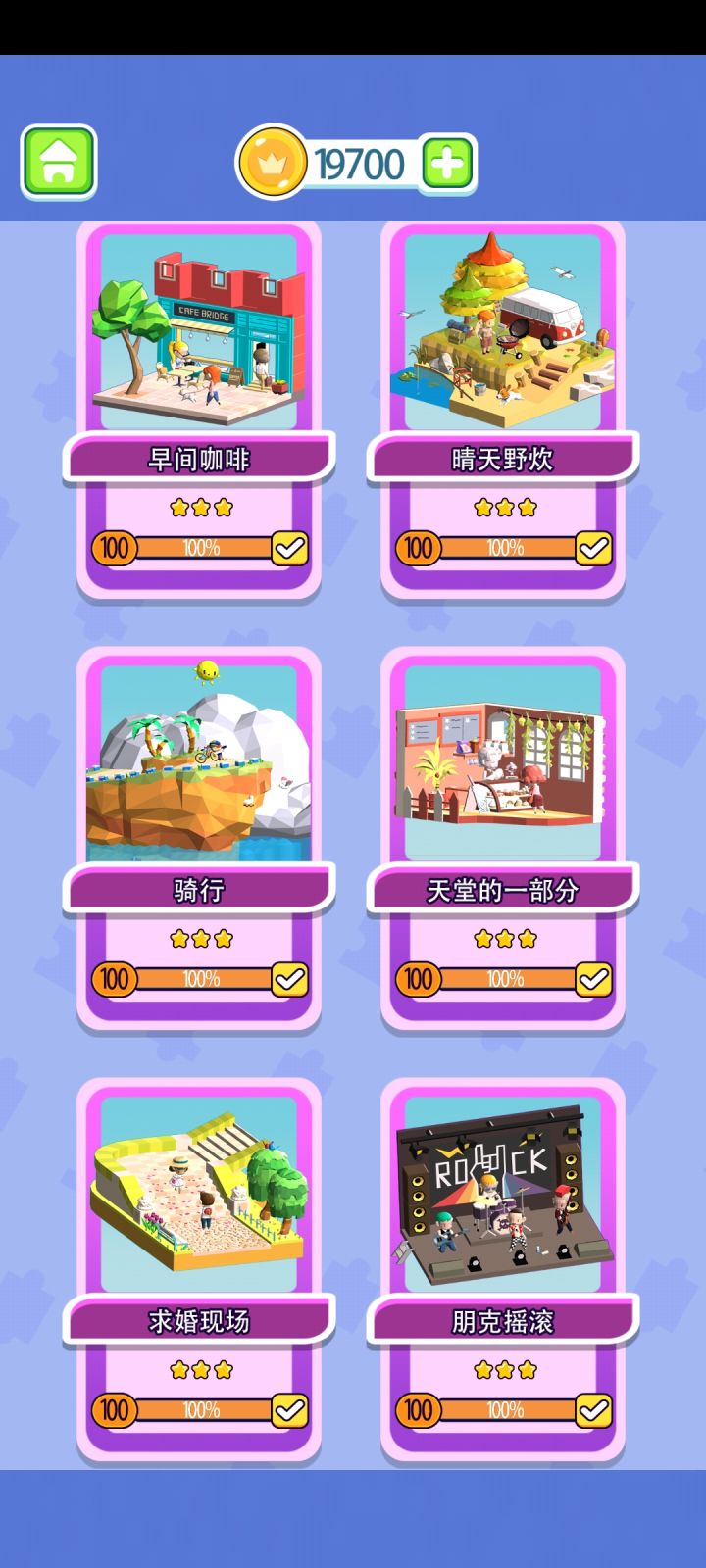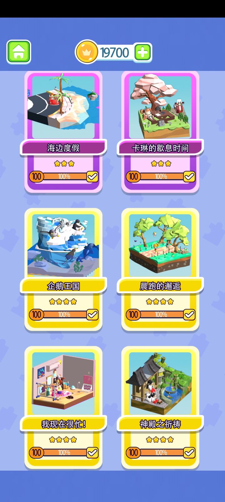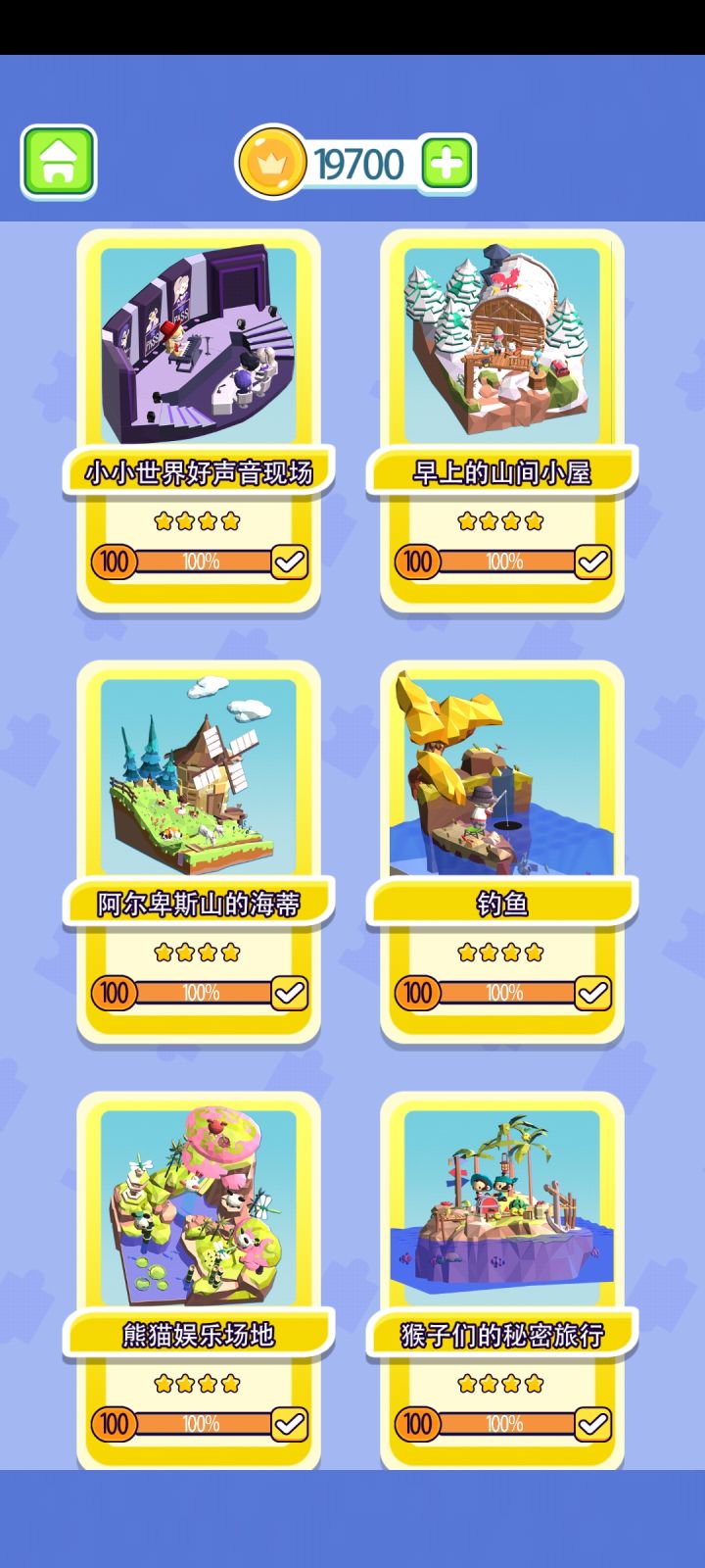 前面的关卡是简单的个体,后面是相对复杂的场景,有些个体还会出现在后面的关卡中,而大场景还有些个体需要单独拼,特殊关卡需要看视频,但是我玩的时候没有放视频直接就解锁了,我觉得挺好