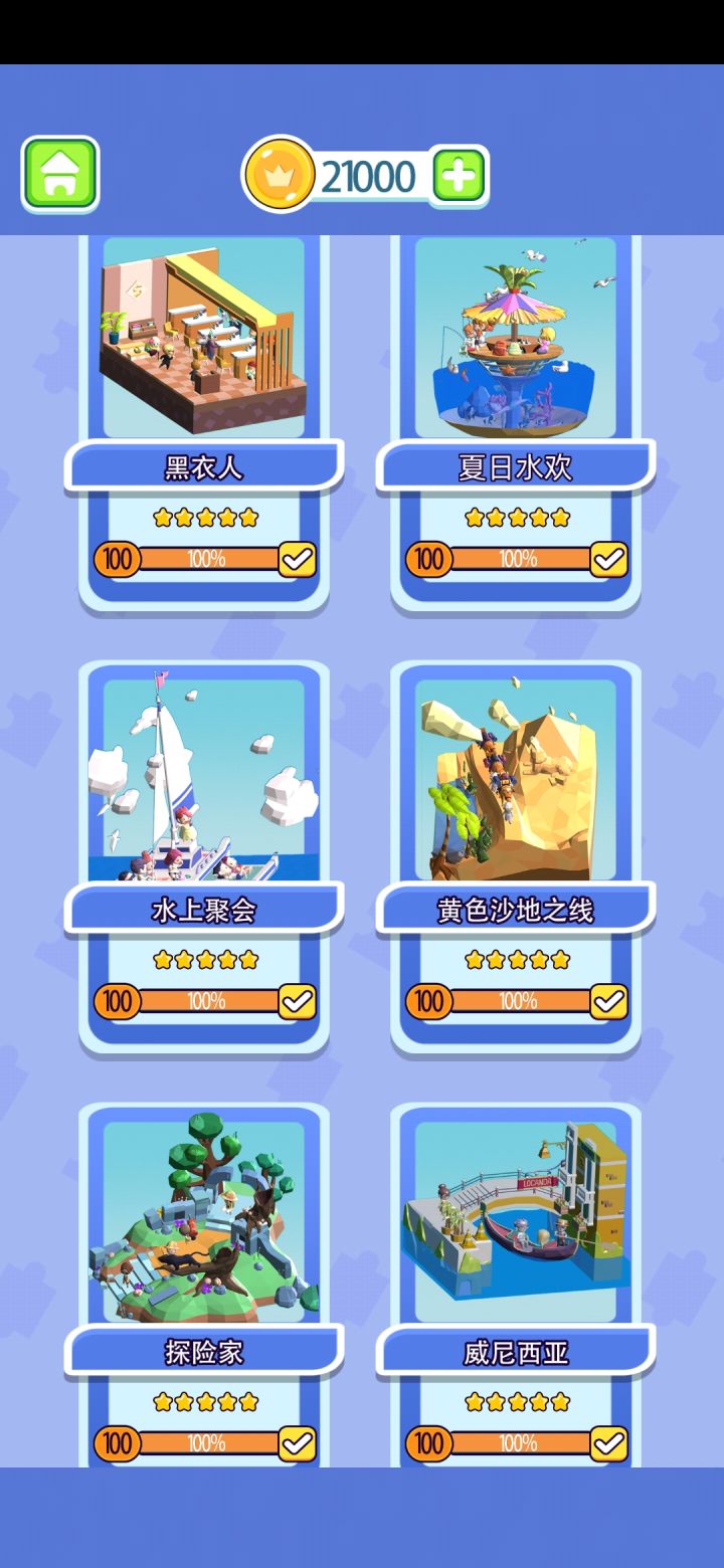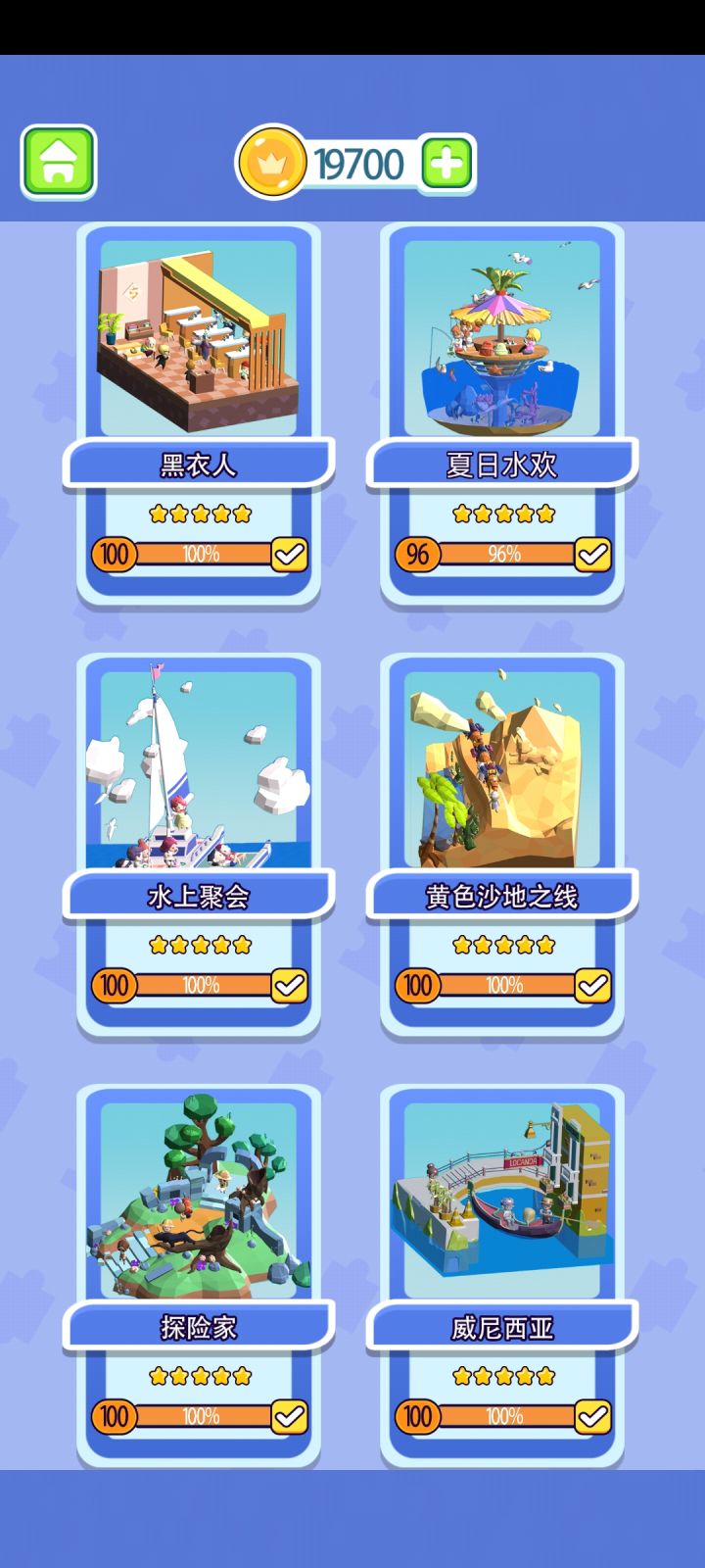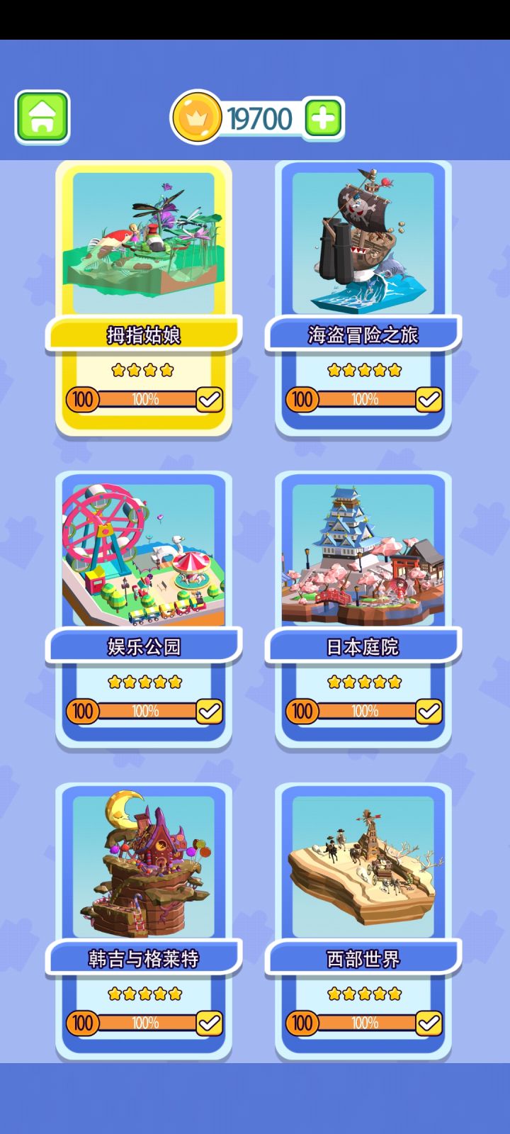 前面的关卡是简单的个体,后面是相对复杂的场景,有些个体还会出现在后面的关卡中,而大场景还有些个体需要单独拼,特殊关卡需要看视频,但是我玩的时候没有放视频直接就解锁了,我觉得挺好
