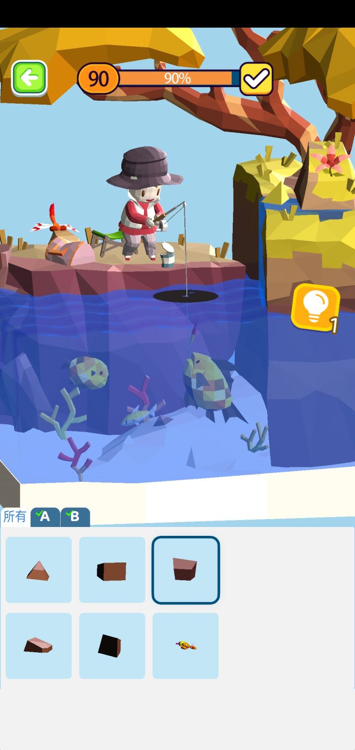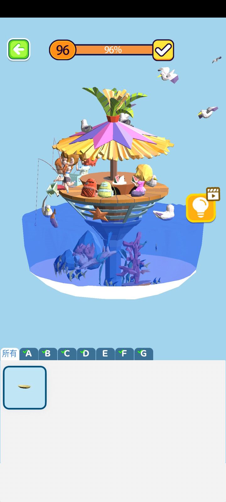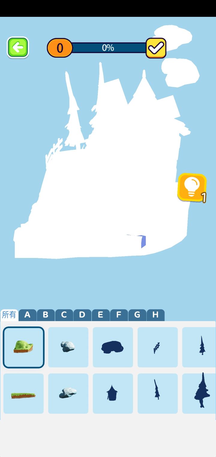 这款游戏应该相当于3D立体拼图吧,每关开始时会展示3秒左右的完成图,然后就是白茫茫的一大块,这样的话前期只能摸索着放。当物体移动到正确位置时物体会闪烁,白色模块会变成黄色(当有顺序问题比如瓶子和之类的看不到内部可以用这个方法摸索,相同零件不同位置也用这个办法判断)