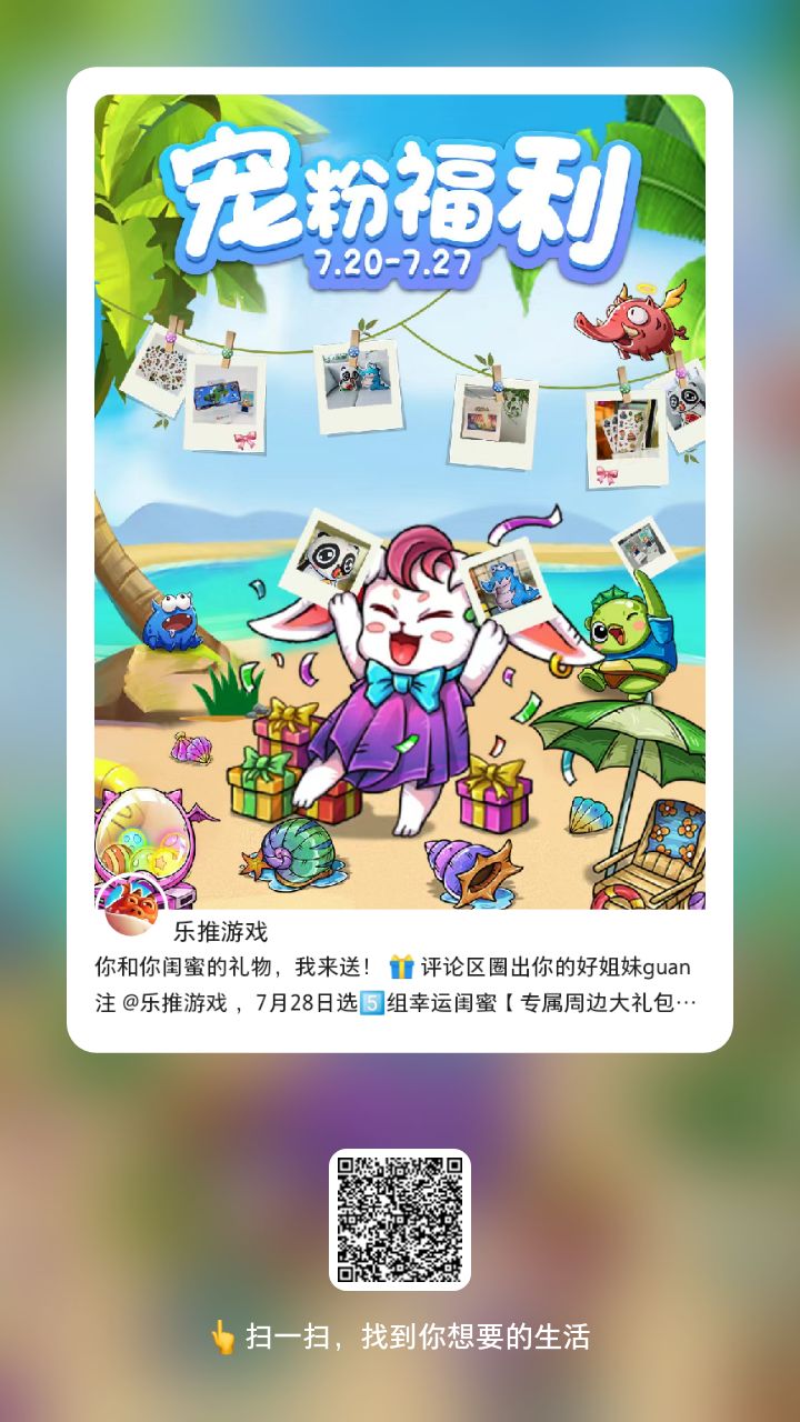 限时福利 | 这种好事,怎能不叫上闺蜜? 🔥🔥🔥 紫色兔兔抱枕重出江湖!! 是谁说过想要? 数量有限,速抢!! 扫图上二维码关注💖官方小红书【乐推游戏】 带上你的闺蜜一起领周边大礼! 软萌熊猫✅调皮小鳄鱼✅紫色兔兔抱枕✅ 任选一 加赠手机支架✅卡通贴贴 全都🈶!! ❗ 7月27日24点截止,想要的快去冲!