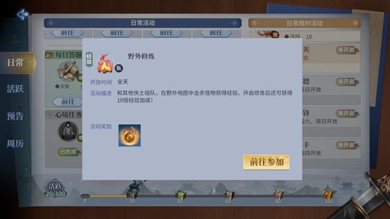 野外修炼是《剑侠世界3》中少侠们提升等级的主要途径之一。少侠可以在10级到70级野外地图选择位置,组队击败野怪来获取经验。等级越高的地图获得的经验越多。击败精英野怪可以获得篝火,在篝火附近会持续获得经验。在篝火范围内还可以通过饮酒增加经验获取。每天还可以使用修炼珠开启修炼状态,在一定时间内获得十倍修炼经验。