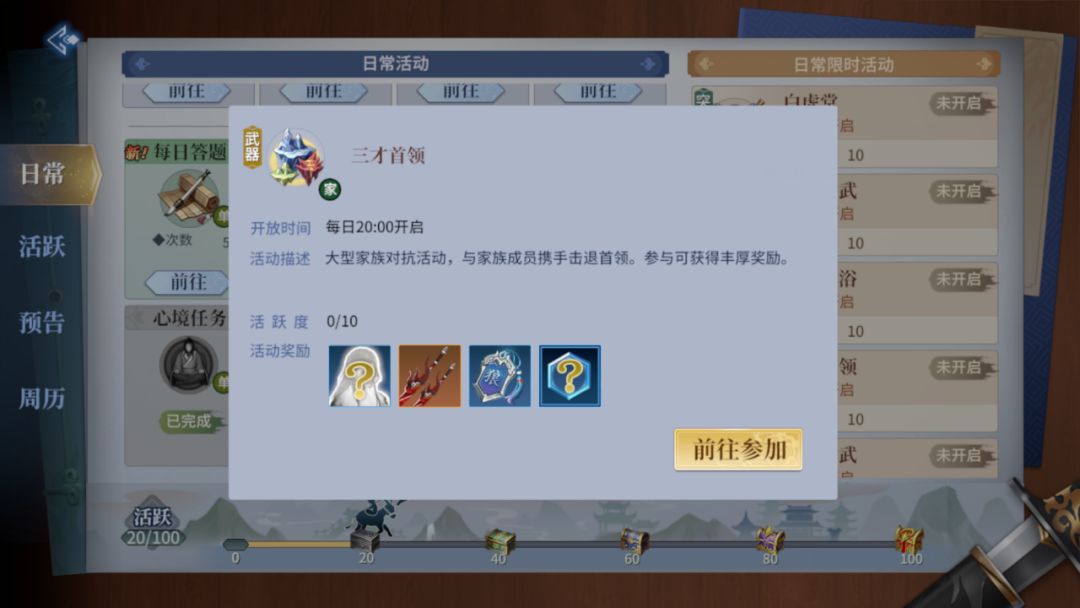 三才迷阵是少侠加入家族且等级达到30级以上可参与的核心活动玩法之一。三次迷阵由【天、地、人】三个场景组成,玩家可根据家族指挥选择进入对应场景参与活动。进入场景后可在安全区的三才童子处进行场景切换。 三个场景内都会在活动开始5分钟后刷出首领,对首领伤害量排行前三且上海不低于1%的家族可以在活动结束时开启家族竞拍(排名越靠前,竞拍奖励越丰厚) 三才迷阵的奖励颇为丰厚,是家族成员收益的重要来源之一。不管