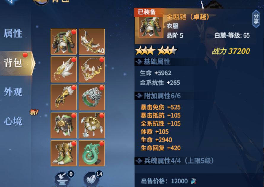 衣服在装备中的地位非常重要,可通过家族兵甲坊打造,或者通过守御试炼活动获取,也可以通过摆摊购买。 衣服是重要的防御装备,可以洗练暴击免伤、暴击抵抗、全系抗性、体质、基础生命、生命回复等属性。衣服可以镶嵌嵌杨影枫、独孤剑、沈卓、凌止等兵魄,大幅提升衣服的综合战力。