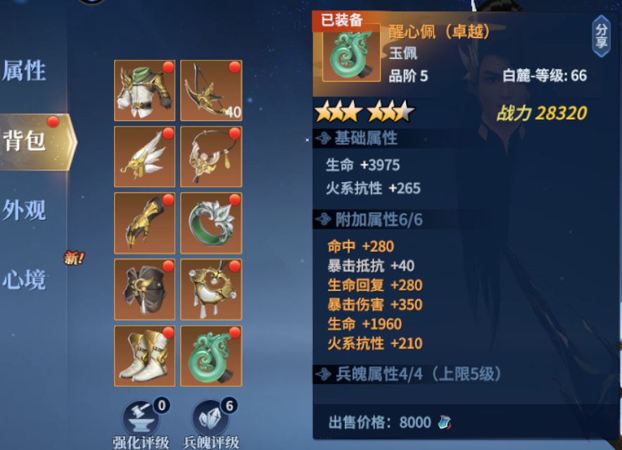 玉佩属首饰类装备,可通过家族首饰坊打造,或者通过商会任务获取,也可以通过摆摊购买。 玉佩可以洗练命中、生命、生命回复、暴击伤害、暴击抵抗、属性抗性等属性。玉佩可以镶嵌冷启、纳兰芷、白秋琳、玄兆等兵魄。