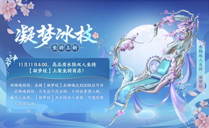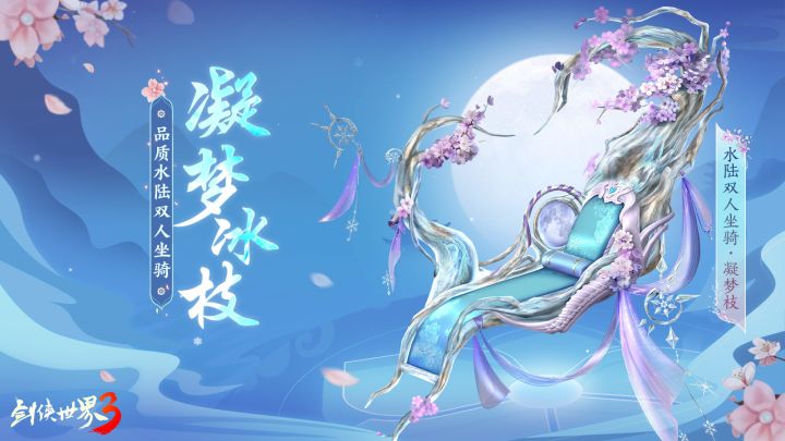 江湖闹锦市!双十一狂欢已落下帷幕,但《剑侠世界3》江湖中的精彩未停歇!四海锦市系列活动火热进行中,全新天工锦匣·皎盈上架天工阁,高品质水陆双人坐骑【凝梦枝】上线,全新极品护法【鬼王小艾】助战江湖。四海锦市年度福利开启,少侠们快前往江湖中一探究竟!【凝梦冰枝!全新高品质坐骑上线】“日色欲尽花含烟,月明欲素情入眠”在被云雾轻抚的绮梦仙踪深处,绮梦仙女轻盈地穿梭于梦绘神木的枝桠间,她的步伐如同梦境中