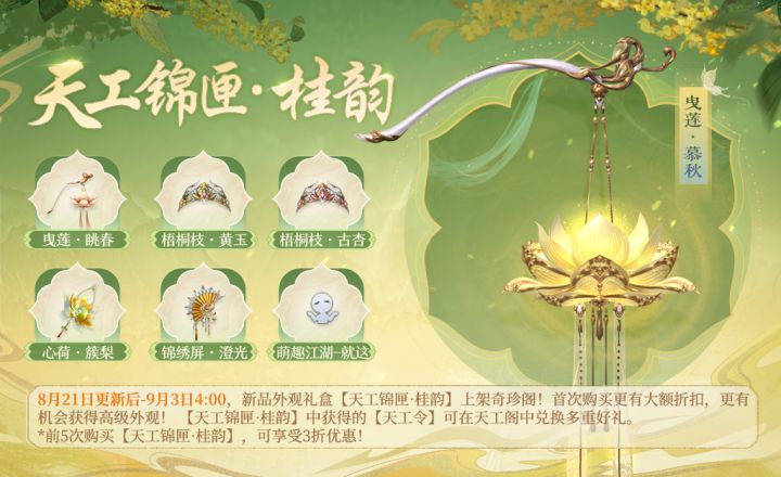 天工锦匣·桂韵系列即将上线,官印新增吸收功能,秘籍断篇也可以分解了,给本期的优化修复点个赞!各位少侠好: 《剑侠世界3》手游全服预计将于8月21日06:00进行停服更新,预计维护2小时。具体的维护内容和开服时间,根据实际情况而定,如未能完成维护相关事宜,实际开服时间可能延后。维护结束后,将随信奉上:元宝*200、家族贡献*500。【活动预告】一、 天工锦匣·桂韵活动时间:8月21日 更