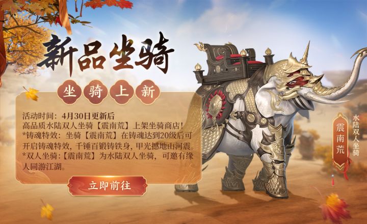 绿树阴浓夏日长,楼台倒影入池塘。暖风点翠,夏日已至,不知少侠们的游戏热情是否也如初夏一般渐渐升温。《剑侠世界3》夏日活动现已全面开启:全新高品质坐骑【震南荒】再掀江湖波澜,铸魂特效和寒光鳞甲护身,尽显猛象荒蛮气息!明教与霸刀两大新门派的【熔烬】系列奇兵震撼登场!群侠问鼎竞技对抗赛火热开启,诸位一展侠者风采,竞逐全服魁首!“千锤百锻铸铁身,甲光撼地山河震”。高品质水陆双人坐骑【震南荒】霸气登场!震