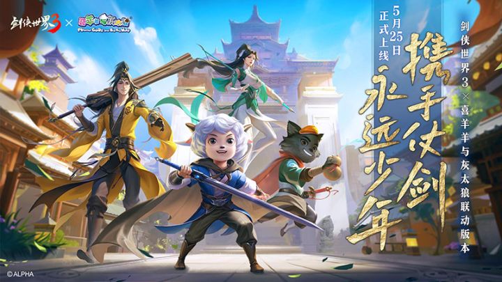 携手仗剑,永远少年!西山居新一代剑侠情缘手游《剑侠世界3》与经典国漫《喜羊羊与灰太狼》5月25日开启联动,海量精彩内容抢先曝光!与喜羊羊和灰太狼共同探索武侠真江湖,全新变身玩法让你重拾童心,变身“喜羊羊”和“灰太狼”,全新非对称对抗竞技活动“狼羊大作战”妙趣横生、策略十足,更有全新联动坐骑时装惊喜来袭......当青青草原遇上剑侠江湖,邀你一同开启江湖新篇章!【喜灰化身江湖侠客,梦幻联动即将开启