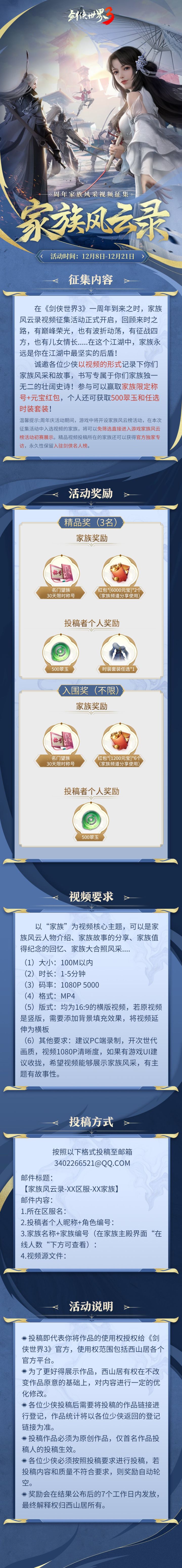 家族,不是单纯的社交群体,它是友爱、义气、情谊的结合体。无论是日常活动还是并肩作战,家族永远为你提供了最坚实的后盾,拥有一群侠肝义胆,志同道合的小伙伴,是多么值得骄傲和分享的事情啊!岁末将近,家族风云录视频征集活动重磅开启!我们将会为你提供一个平台——在全服玩家面前,秀出你们家族的实力,分享属于你们家族的故事和回忆,还有丰厚的家族奖励(限定称号+家族元宝)、个人奖励(翠玉奖励/任选外观套装)等你