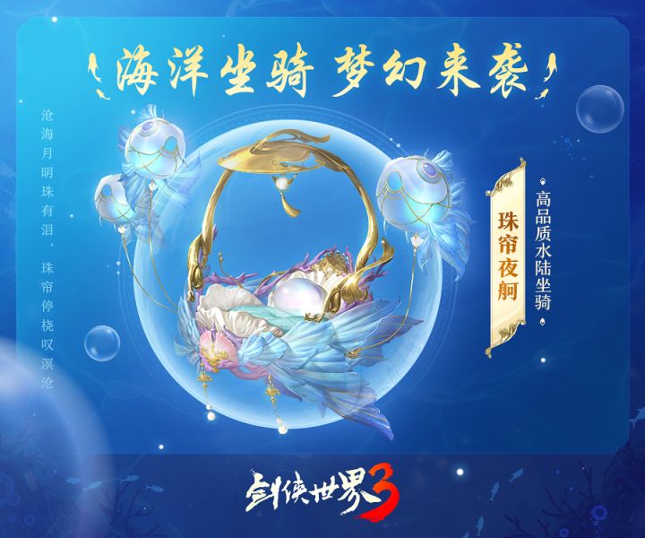 【新坐骑】沧海明珠&冰雪精灵梦幻来袭!一次性给你双倍惊喜!沧海之际,绝美鲛人临月吟唱,深海珠贝化为鲛人座下之骑极北之地,雪中精灵展翅翱翔,化为信使穿梭剑侠江湖!高品质水陆双人坐骑[珠帘夜舸],萌动水陆单人坐骑[雪跳跳]将于7月13日浪漫来袭,让你一次性享受双倍的快乐!他们从何而来?又有着什么样的故事呢?让剑娘为你逐一揭秘!【珠帘夜舸】世说南海之外,有鲛人,水居如鱼,不废织绩,其眼泣,则