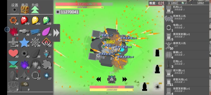升级就是狗屎,一个武器升级你只能用最多6个武器,一个好武器升级你得用比他更好的武器去升级,不然完全升不了,我有更好的武器我为什么不装更好的呢?在品质有差距,等级有差距完全完全升不了,除非同款高级高品质武器有多,一个想要的武器半天不出,勉强能升一下。像磁轨炮,机枪,霰弹枪就是低品质武器,黑洞,电塔,激光这种就是高品质武器。有这个功夫低级合进高级,低品质灌进高品质,再作为素材充进想要的武器里,这边建议把它卖了去商店抽。商店,强化5次后,扩容一次后钱一样的,后期强化到紫色的概率最大蓝色其次差不多就可以了,金色的有了后就没用了,扩容多多益善,相比来说刷新跟不要钱一样。变强等于买买买,卖卖卖,杀杀杀。后期多少屯点随便什么高级武器,你去买也行,整个十几架飞机,炮台,无数修复无人机,战斗无人机,装上武器,装上修复站,手机插上充电线,原地挂机,过段时间过来商店刷刷刷,买买买,相比于这种玩法,怪没什么好讲的,中期冰蛋爱躲躲,要么就让他装好了,前期不要在一个地方打太久,猎手会布置地雷。