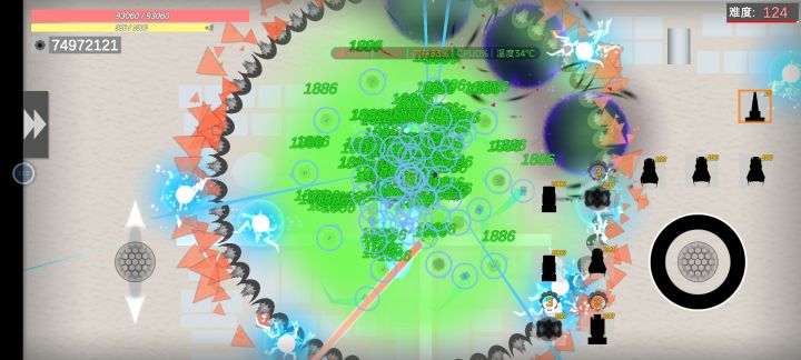 一进游戏,左边代表着是我们的移动键,右边代表的武器攻击的方向键,这游戏载具控制难点也就在这里了,需要控制武器的攻击方向,不会控制就会missmiss,击败小怪可以获得武器,武器可以装载在炮台上