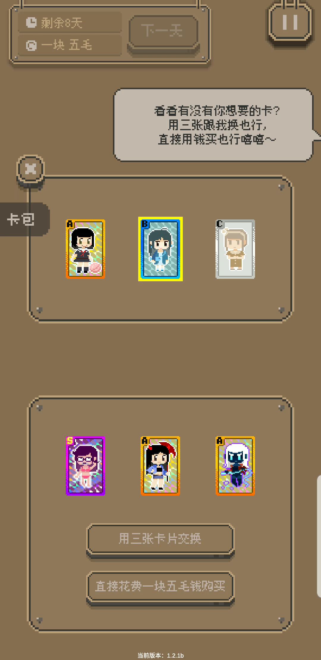 第一段视频没有了,只有第二段了。 好了还是靠文字吧! 1.如果前三天一开始抽不到s卡和a卡就一直月光,钱每天都用完。 2.感叹号是福利,一定要领啊,尤其是路上的钱(笑) 3.前三天后再跟铁蛋换卡,如果你的c卡多并且铁蛋也不要你的高级卡,前