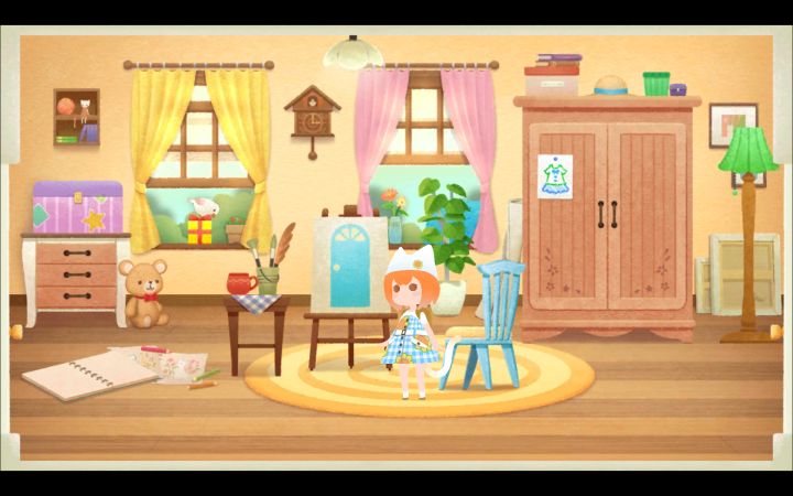 家具布置虽然给我一种粥游+必蓝结合体的感觉(也没玩过多少手游),但实际上保存之后主角和偶尔客串的猫咪会在家具贴纸区域之外的地方活动,地板明显扩大了一大块。主角放置不管一段时间会跑来跑去做动作卖萌XD