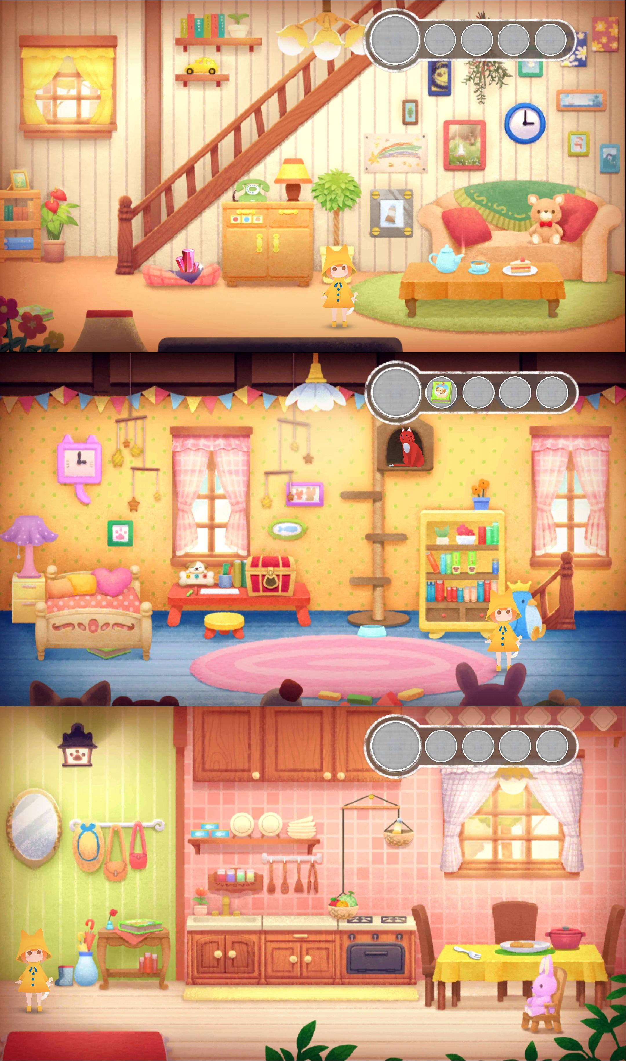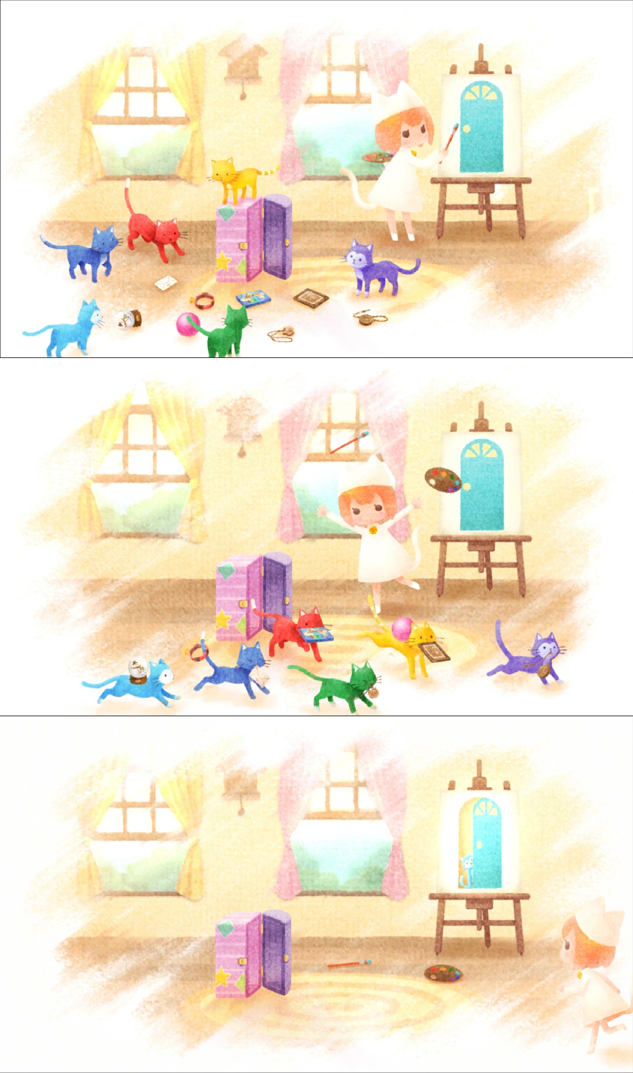 第二部通关了,这一部换成横屏了,但是整体容量大大增加。第二部共9关,每关后还带有4个赠品游戏。主人公小女孩要在每一关内找到4管颜料,打开宝箱,获得小猫咪带走的物品。游戏剧情是老年的女孩抱着相册在回忆自己和小猫的故事:小女孩小时候曾在公园里捡到一只流浪小白猫,和它画画、玩耍,小白猫也生下了红、黄、绿、青、蓝、紫六只小猫,随着时间流逝,小白猫去世了……游戏场景比第一部丰富了很多很多,公园、家里、草地