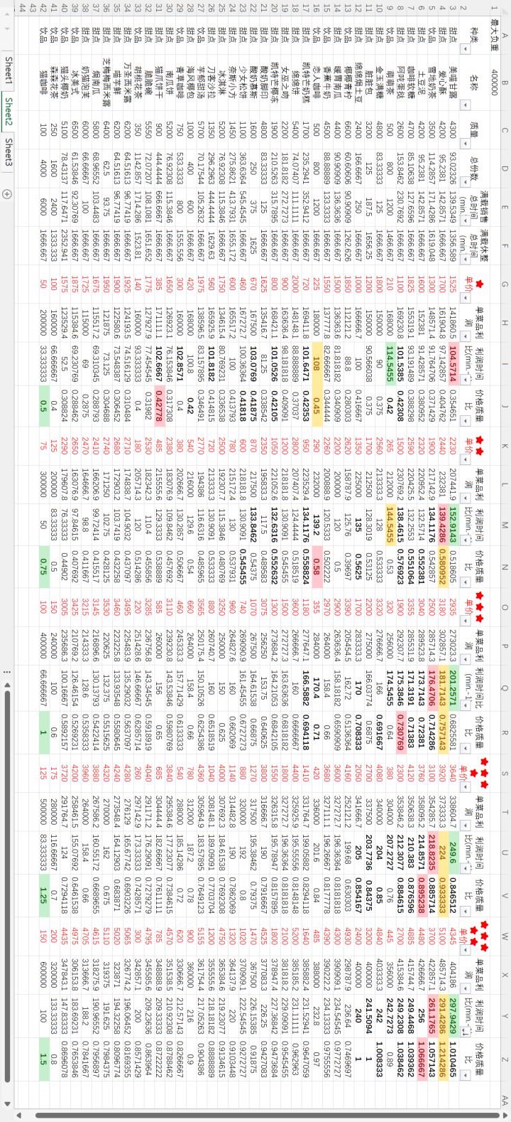 在这篇长帖中,我会修正原帖的错误,并给出不带猫咪时小车休整时间的计算方案。一、结论下图中以车负重400000为例计算。改变车的负重,各项最值所对应的菜品不会改变。这张图是演示用图。为了便于查看,我会把分星级排序表附在文末。注 论坛及评论区内有大佬提到,如萌萌茶、爱心酥。本帖参考其数据。接着我来说怎么看这张图。分两种情况:1.白天在白天上线勤快的情况下,选择利润时间比最高的菜。菜品星级