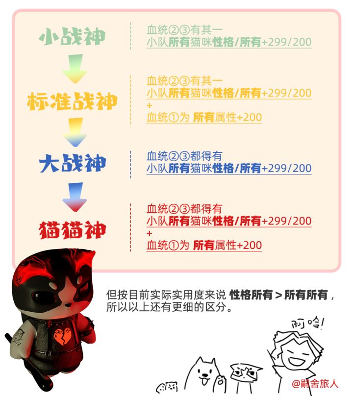 结论放在前面:配种生猫不要停!养猫要投入的资源需要很多,拉扯大一只猫真的很不容易。宝藏关卡会对性格有要求,所以每种性格的猫至少要养一只战神猫。什么样的猫是战神猫呢?就是二代猫中第二条强化词条为“小队所有猫所有属性+200”或者“小队中所有xx性格猫属性+299”的猫。下面俩是还没改性格的 其中小王子池的八条是霸道战神,强度党必抽or先兑换。其次是鲁鲁,胆小战神,兑完八条可以兑鲁鲁。其他三个性