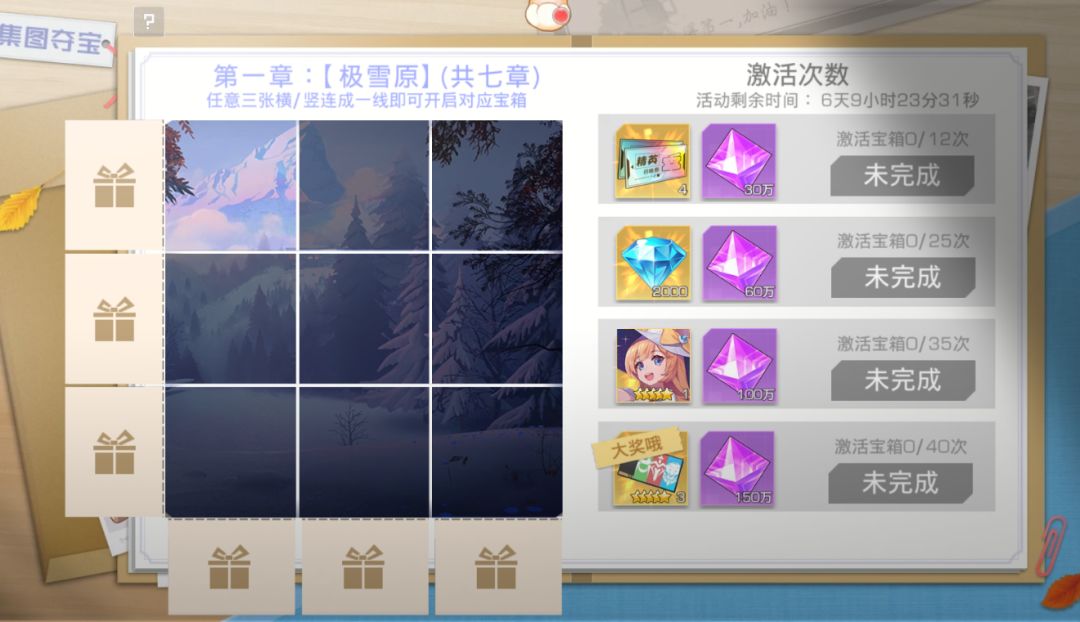Hi,探长大大们,小橘来啰,今天给大家带来的是福利活动—集图夺宝活动大讲解,论如何白嫖五星核心卡,策划听到会不会打死我,哈哈哈~ 活动其实很简单哒,只要探长们完成每个各自当中的任务就可以领取每个格子的奖励,完成一横排或者一竖排任务后,就可以开启宝箱啦 活动期间,拼图一共分为七个章节,累计完成章节还有丰富的奖励可以领取,章节任务每天都会刷新,所以探长大大们记得尽量当日完成哟 激活宝箱到一定次数后,就