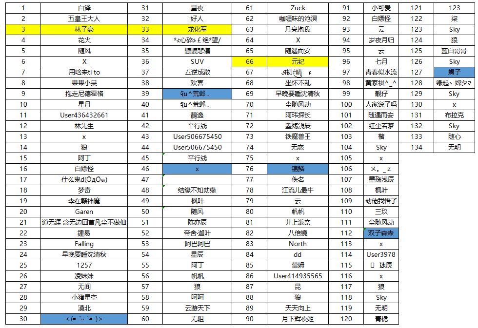 taptap的中奖名单,只统计能够外显和按照活动格式参与的 黄色的是本体活动奖励:花木兰、撒旦、真涯、精卫、指挥官自选其一 蓝色的是幸运礼包礼包内容:666饰品精华、666钻石、1666进阶石